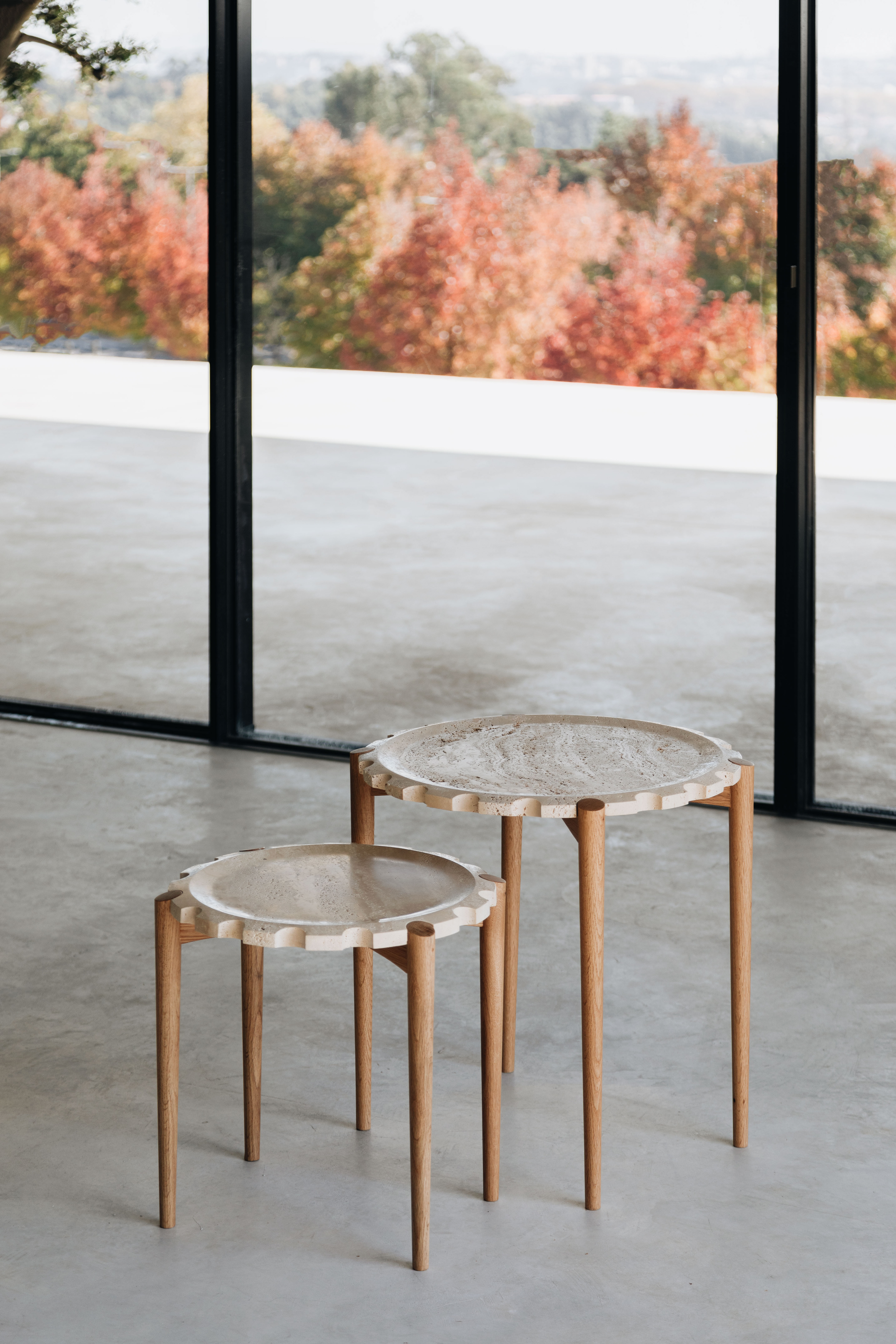 CLOCK is a versatile side table in a contemporary style designed to complement the living spaces' décor. The marble stone top merges perfectly with the wooden legs. Structure in solid turned wood, top shaped in a 5-axis milling machine and rigorous manual finishing so that every detail is preserved.